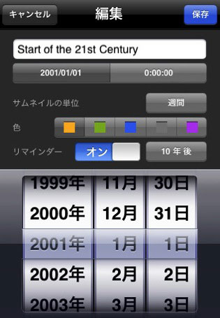 購入のきっかけはやはりデザイン。時計のように動くリングと5つのカラー、文字の適度な大きさ。それと1イベントの表示項目の豊富さです。この見せ方もデザインを考慮してあり、見た目キレイに表示されます。右の項目部分をタップするたびに月、時、分、秒と表示が変わり手軽に時間(人生?)の経過を楽しめます。イベント数もいくつも増やせるようですが、限りはあるのでしょうか?(画像左)